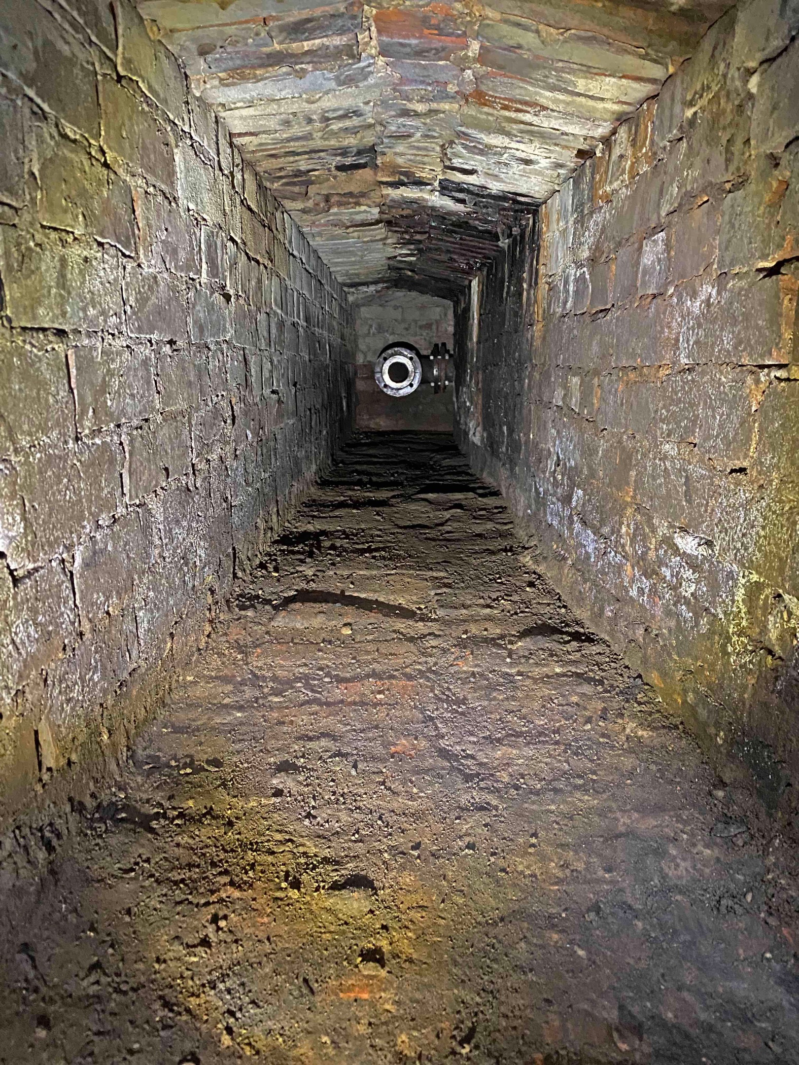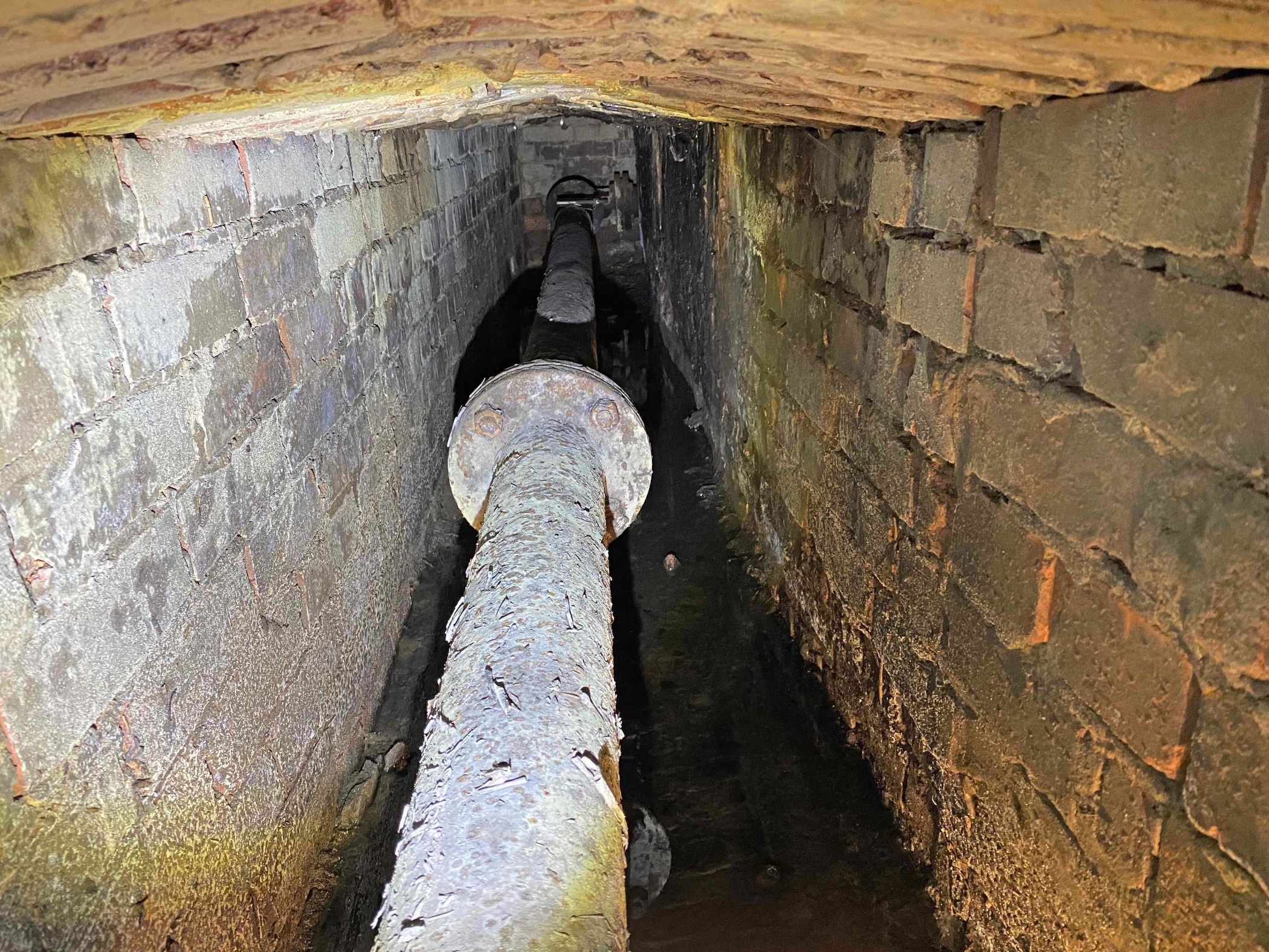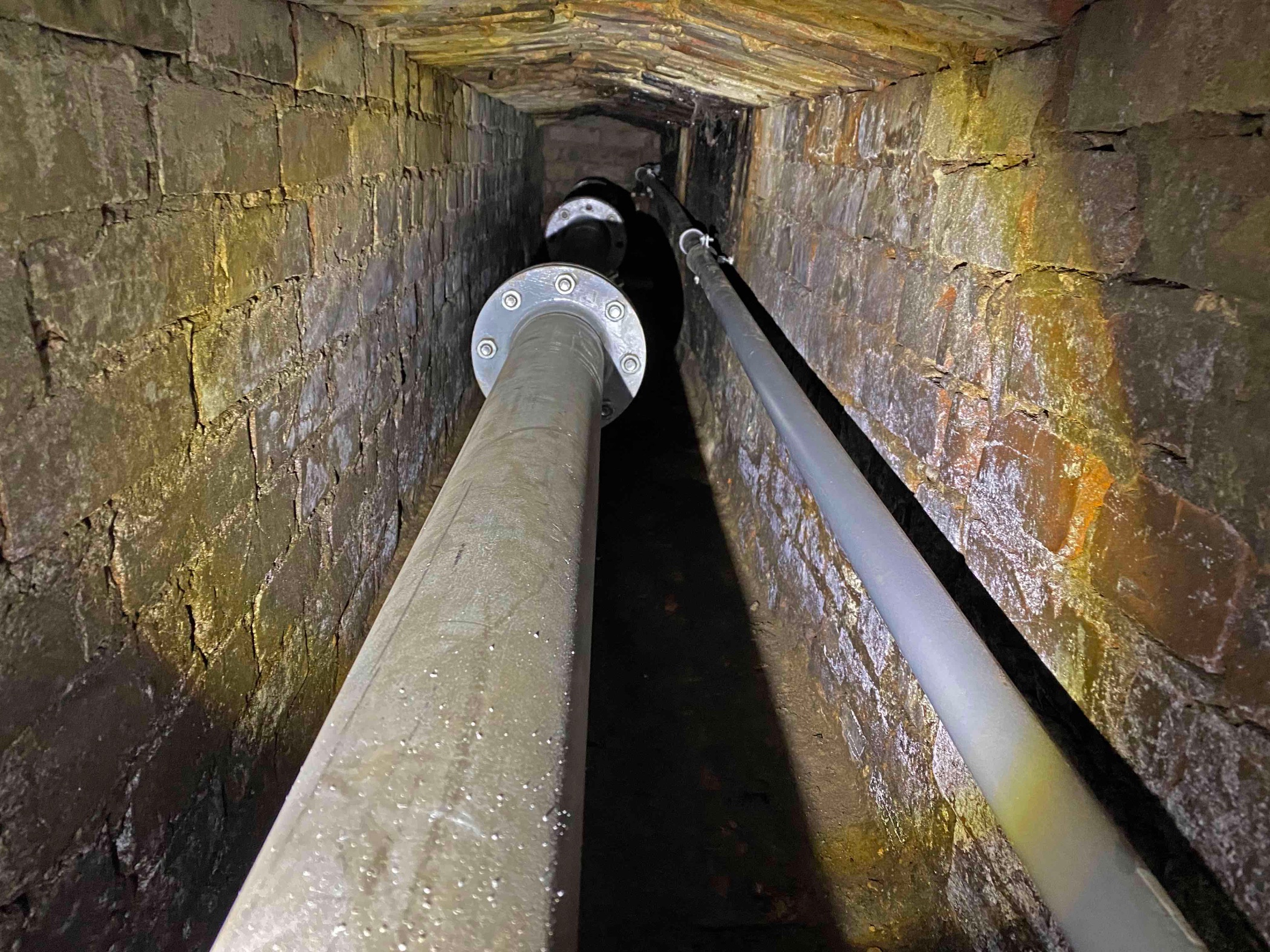 Leider mussten wir den Motor nach kurzer Zeit abschalten, da ein Loch in einem alten Gussrohr der Abgasleitung die Abgase durch die Bodenbleche ins Motorenhaus beförderte. Während die Lokalisierung des Lecks noch leicht war, stellte sich die Reparatur als Herausforderung dar, da das 4 Meter lange Gussrohr fast zwei Meter unter dem Motorenhaus, in einem engen Backsteinkanal eingesetzt wurde. Unter schwierigen Bedingungen, konnten die 107 Jahre alten Schraubverbindungen in dem Kanal gelöst werden und das defekte Rohr in mehreren Einzelteilen herausgeholt werden. Die Arbeiten wurden genutzt, um den Kanal zu reinigen, das defekte Rohr durch ein Neues zu ersetzen, die Leitung spannungsfrei auf neue Rohrschlitten zu setzen und das Kühlwasser durch eine neue Leitung gezielt abzuleiten bzw. für einen Kreislauf vorzubereiten.