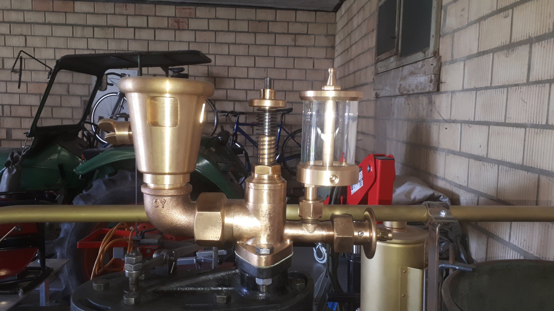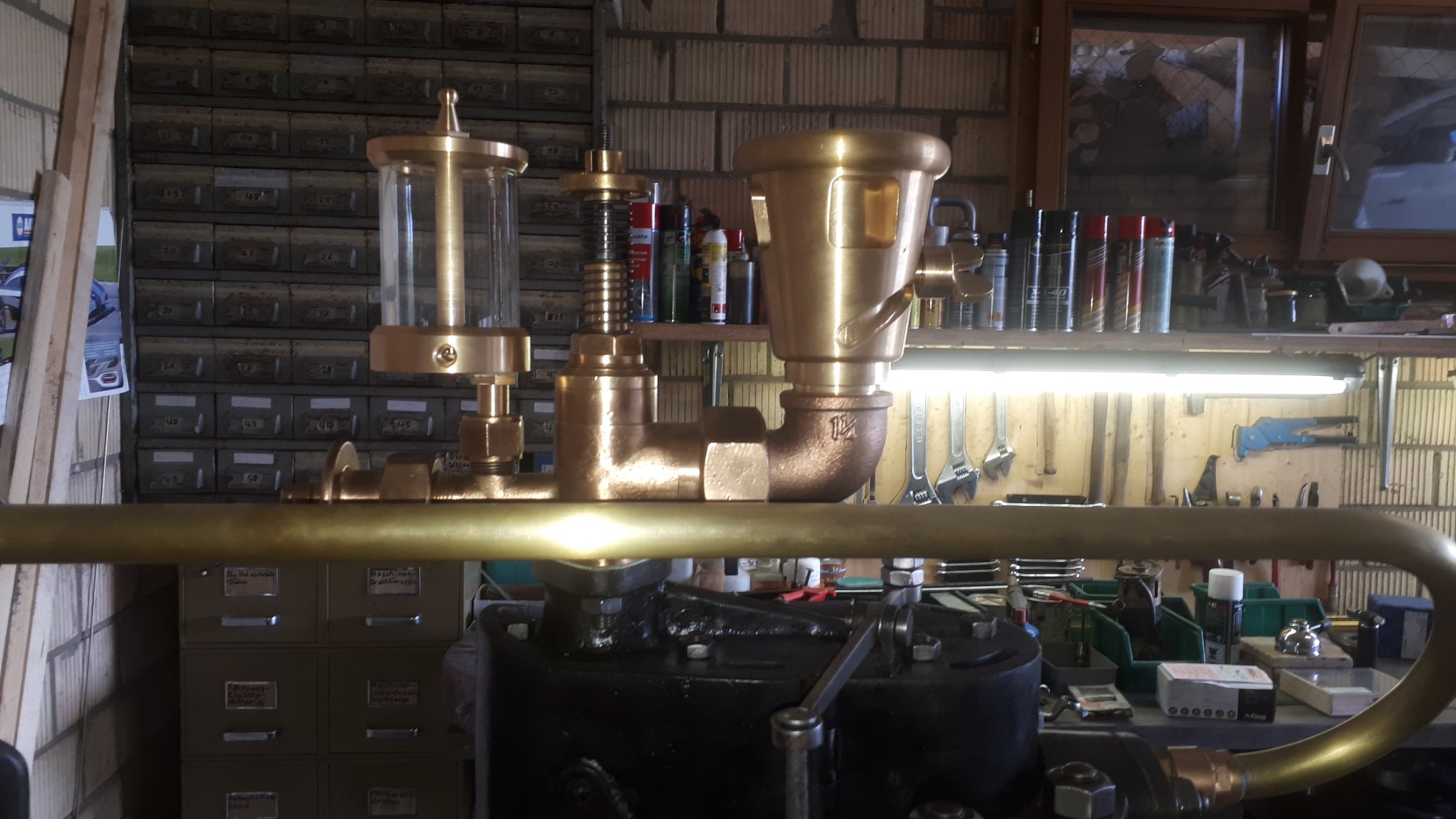 Endlich geht es weiter. Als Treibstofftank verwende ich nun erst Mal die Benzinlötlampe. Mit ihr pumpe ich das Petrol in ein Schauglas welches direkt oben auf dem Anschlussstutzen des Ölventil sitzt. Durch einen weiteren Abgang / Leitung wird der Brenner der das Glührohr und die Vorkammer in welcher das Petrol verdampft wird gespiesen.