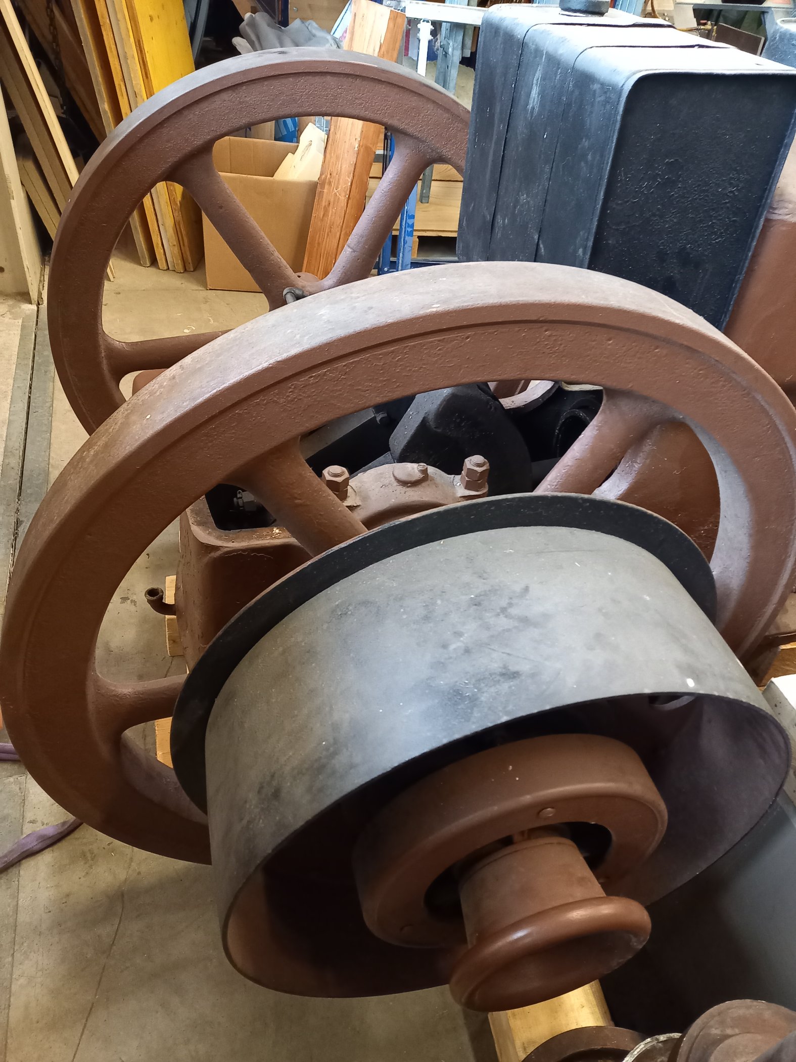 Die beiden Schwungräder messen 1m im Durchmesser und die einkuppelbare Riemenscheibe misst 60cm.