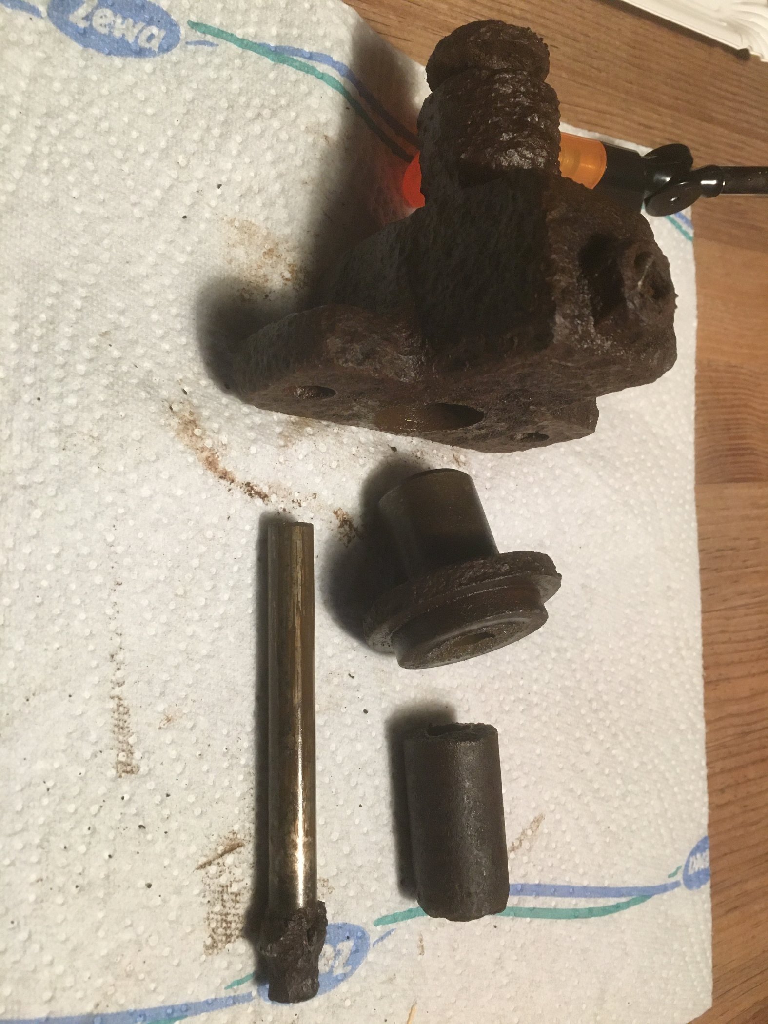 Ich habe versucht, die Plungerbuchse aus dem oberen Gehäuse zu schlagen. letztlich gelang das mit Keilen. Dann gab ich einen Schlag mit dem Durchschlag auf den Plunger, der setzte sich leicht in Bewegung und ließ sich herausklopfen. Mit dem Plunger fiel auch der untere Teil der Buchse ab, die ist aus Gusseisen (woraus hätte die sonst sein sollen) und ist beim Schlagen gerissen.