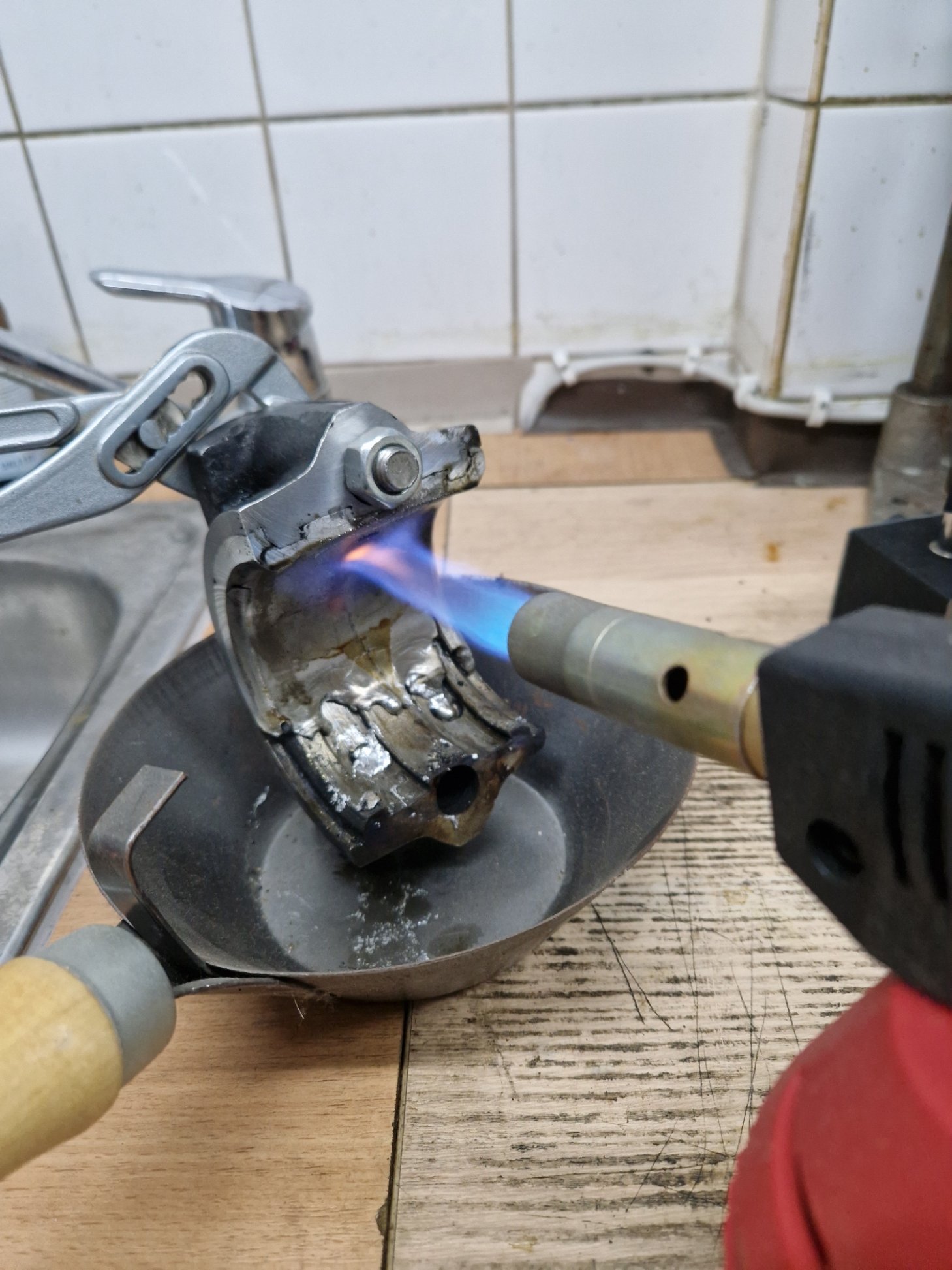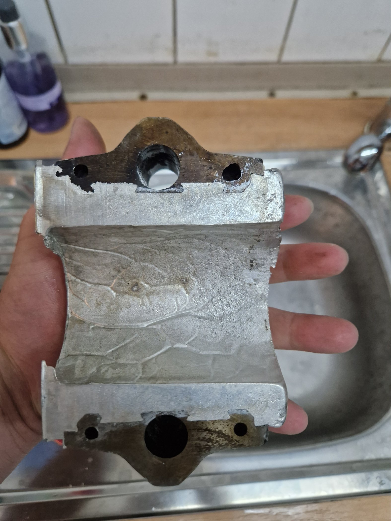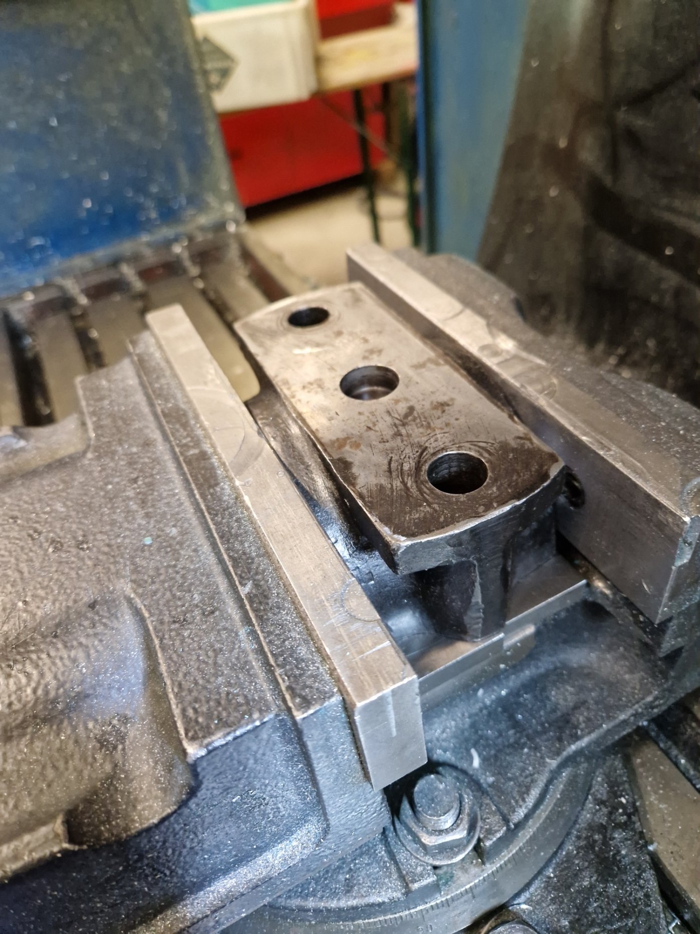 um beim ausspindeln die parallelität der achsen zwischen großem und kleinem pleulauge zu gewährleisten habe ich hauchzart referenzflächen plan gefräßt im 90°winkl zueinander die fürs spannen auf der fräse relevant werden um eben die parallelität der achsen bestmöglich sicherstellen zu können. das mess ich mir mit der mess uhr an den stellen wo ich drübergefräst habe dann schön aus bevor ich mit dem ausdrehwerkzeug reinfahr....so der plan