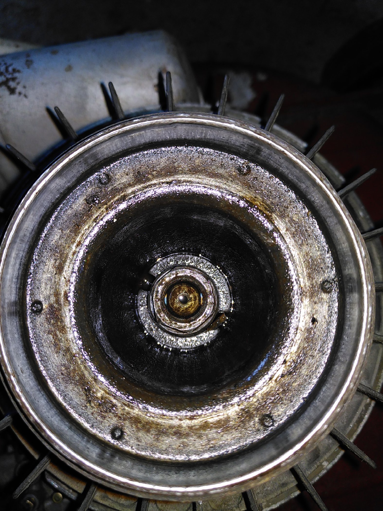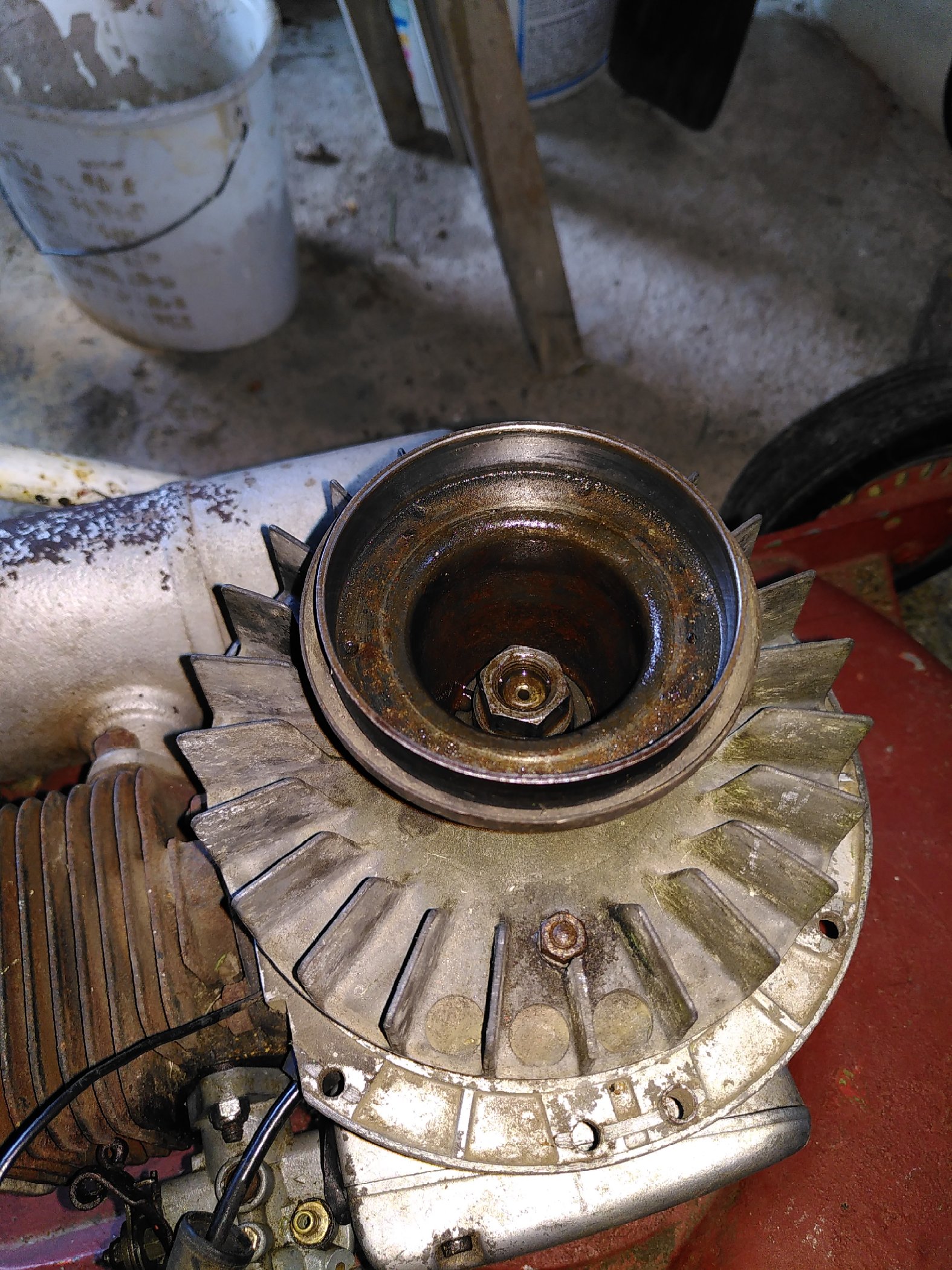 Oberhalb vom Polrad sitzt eine Lüfterscheibe (mit drei Schrauben am Polrad dran). Oberhalb von dieser Lüfterscheibe sitzt so ein Trichter. Der Trichter ist mit einer Mutter M19 irrc an der Hauptwelle dran. Ich krieg die M19 nicht runter!! Gibt es da irgeneinen Trick?? Hab schon geschüttelt und gewemst wie Arnold Schwarzenegger, aber die bewegt sich null. Und wo soll man da kontern? Die Mäher-Messer unten drehen mit...