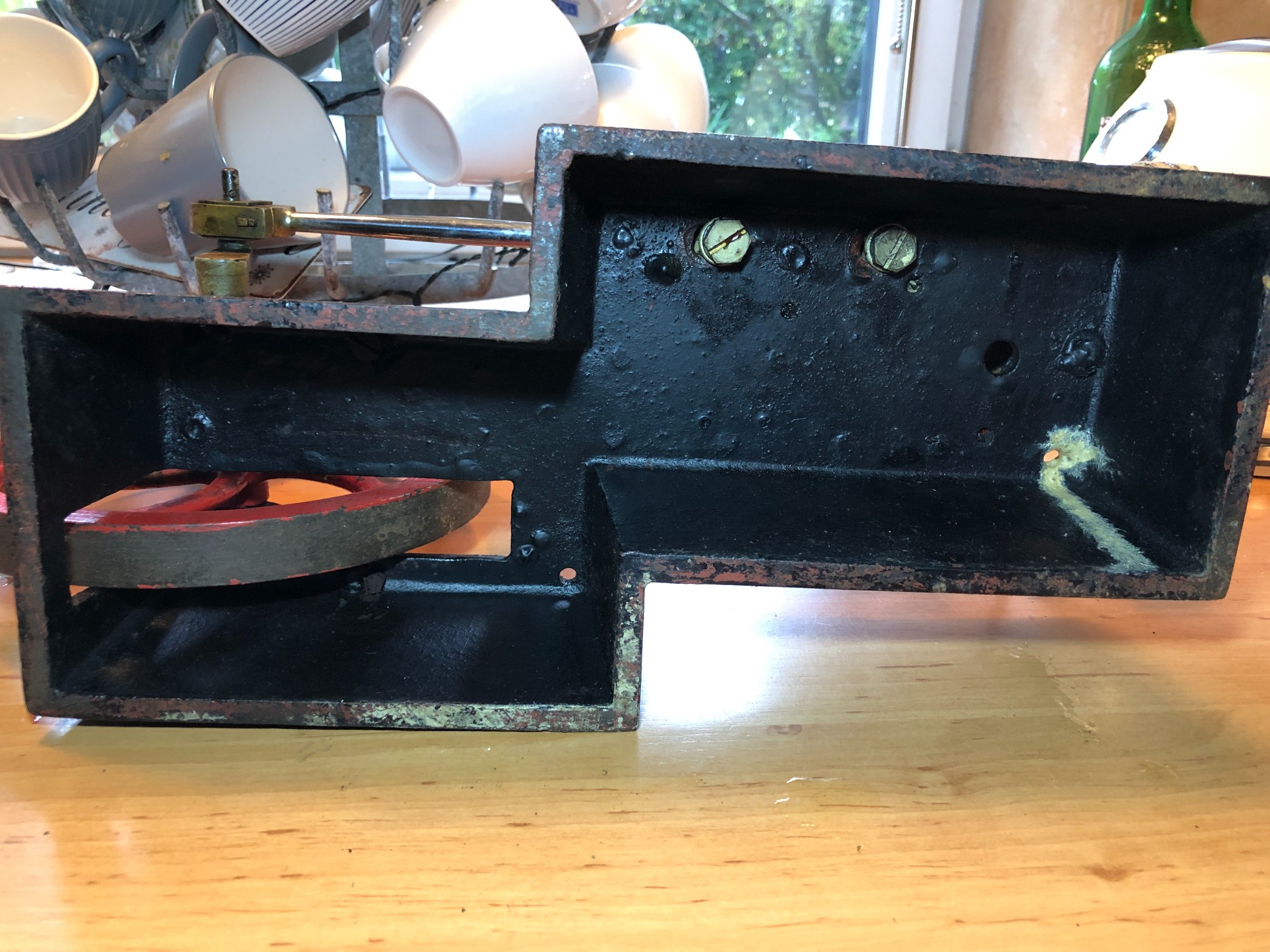 Ist das wirklich ein Vorführungsmodell ? Am Sockel sind einige Löcher und Anschlüsse, welche mich ein wenig zweifel lassen. Der Luftanschluss jedoch deutet auf ein Modell hin. Oder Reste einer Dampfleitung ?