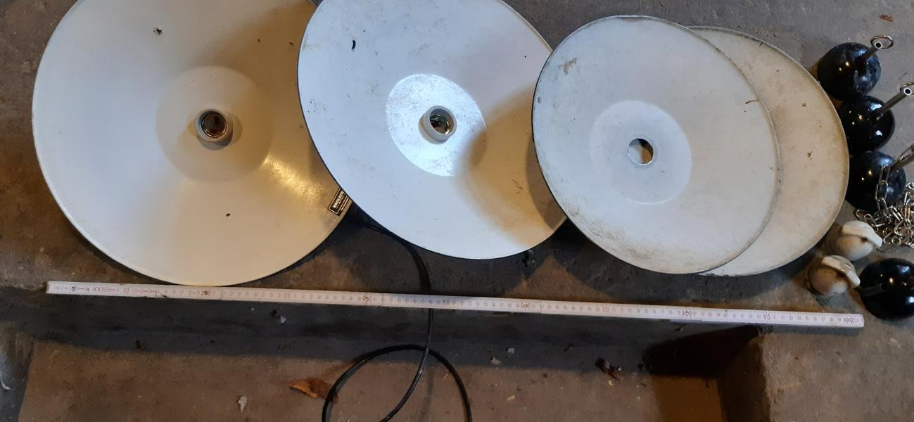 Gebe ein Set = 4 Stück Lampenschirme 40 und 35 cm Durchmesser, Aluminium Weiss und Schwarz beschichtet, Fabrikat "Bolichwerke bzw. Ebolicht" komplett mit Fassungen und Baldachinen ab, siehe Fotos. Versand möglich.