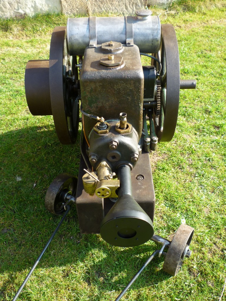 Zündkerze im Motorblock, Oelstand mit Schauglas, Messingvergaser mit zwei Schwimmerkammern, runder Zylinderkopf