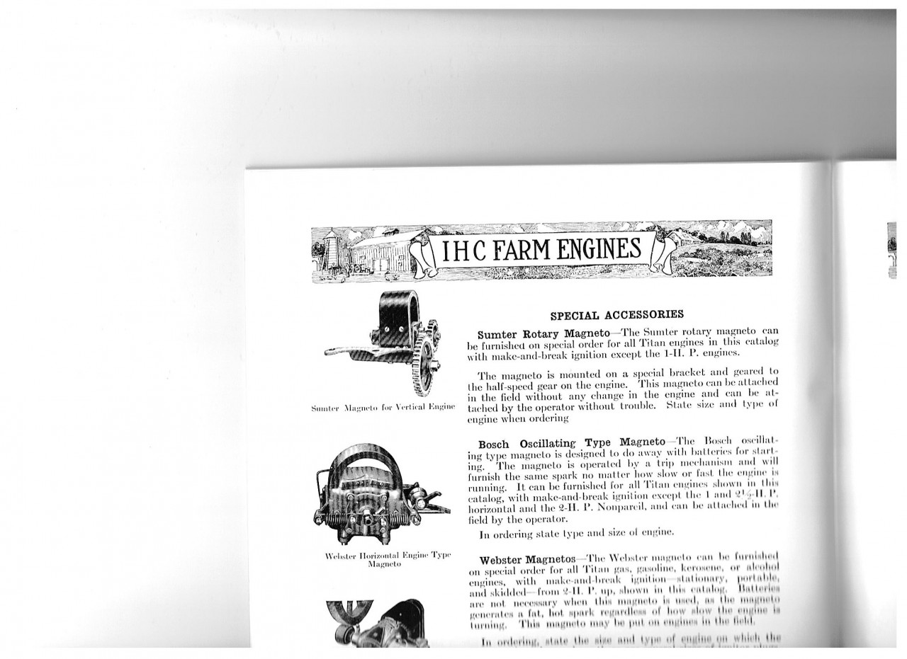 Anbei zwei Fotos von eine alte IHC Katalog. Die Famous und Titan vertikal Motoren hätten Standard Batterie Zündung. Auf sondre Bestellung könnte Mann Sumter Zündmagnet bekommen, aber da unter steht dass Mann eine Bosch Ossilating Typ bekommen könnte auf alle Modelle außerhalb die kleine horizontal Motoren. Die kleine Haken auf Ihre Foto deutet auf ein Bosch.