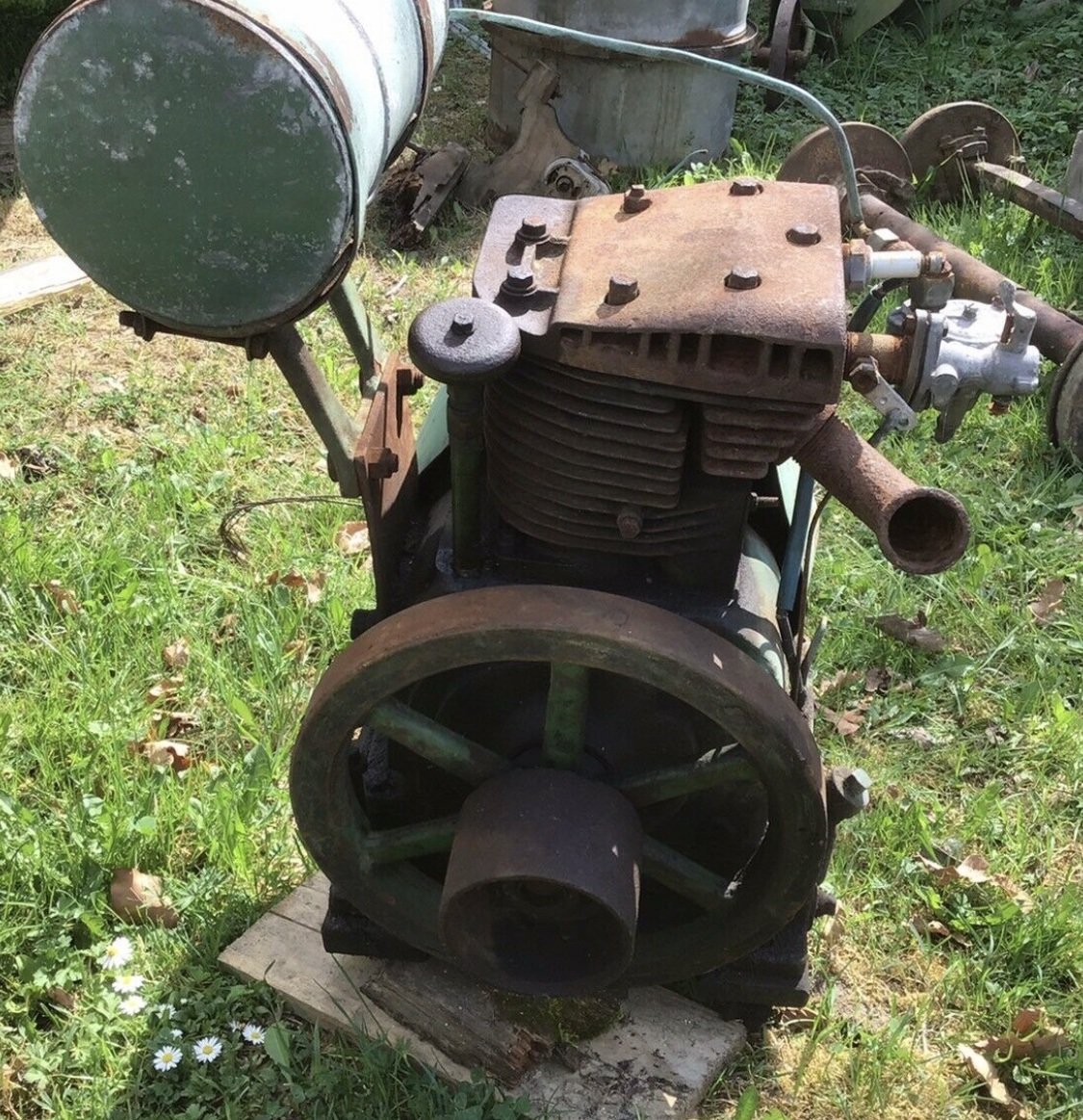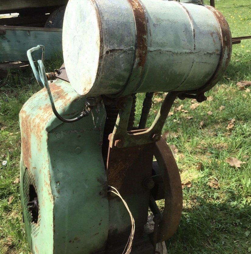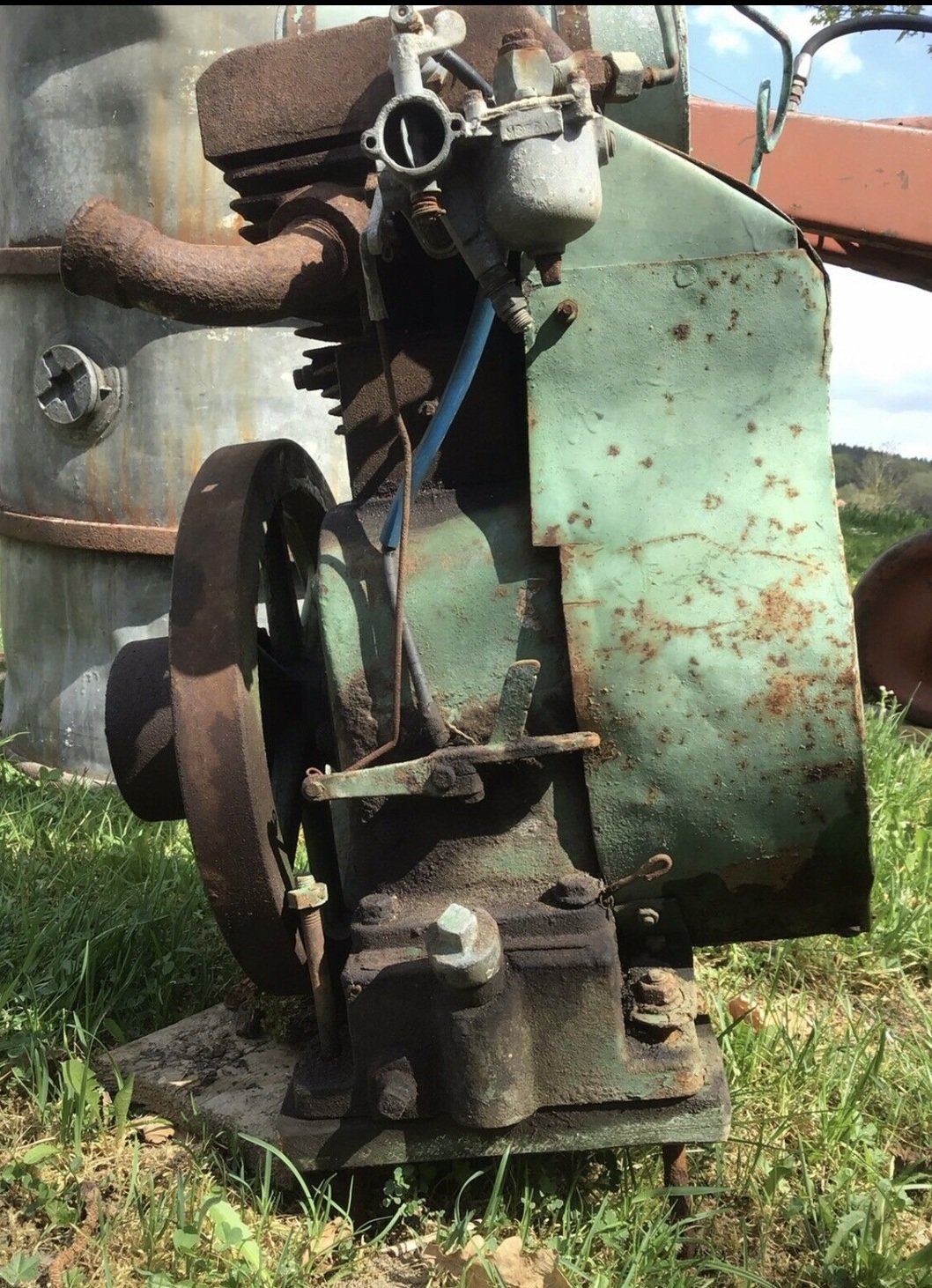 Die Bauform ,Zylinderkopf ,Regelgestänge,Motorensockel usw sind ähnlich Wisconsin air cooled. Jedoch ist das Luftleitblech wieder zu eckig,vielleicht nach gefertigt. Ob das Speichenschwungrad original ist ?? Wenn du die Schwungscheibe mit den "Luftschaufeln" abnimmst wäre dann eine Schwungradmagnetzündung verbaut!?