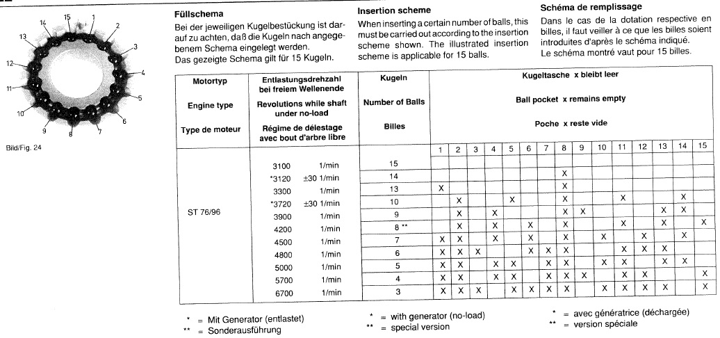 Hallo zuerst mal ein großes lob zur gelungenen seite ,leider konnte ich keine infos über den Grobregler in den st motoren finden,ich weis das dieser regler über die anzahl der kugeln die drehzahl bestimmt und wenn ich richtig liege je mehr desto niedriger die drehzahl gibt es irgenwo jemand der mir sagen kann wieviel variationen es da gibt drei verschiedene habe ich schon gehabt konnte aber nie zuordnen welche drehzahl dazu gehört und das anordnungsschema gibt es da eine liste?