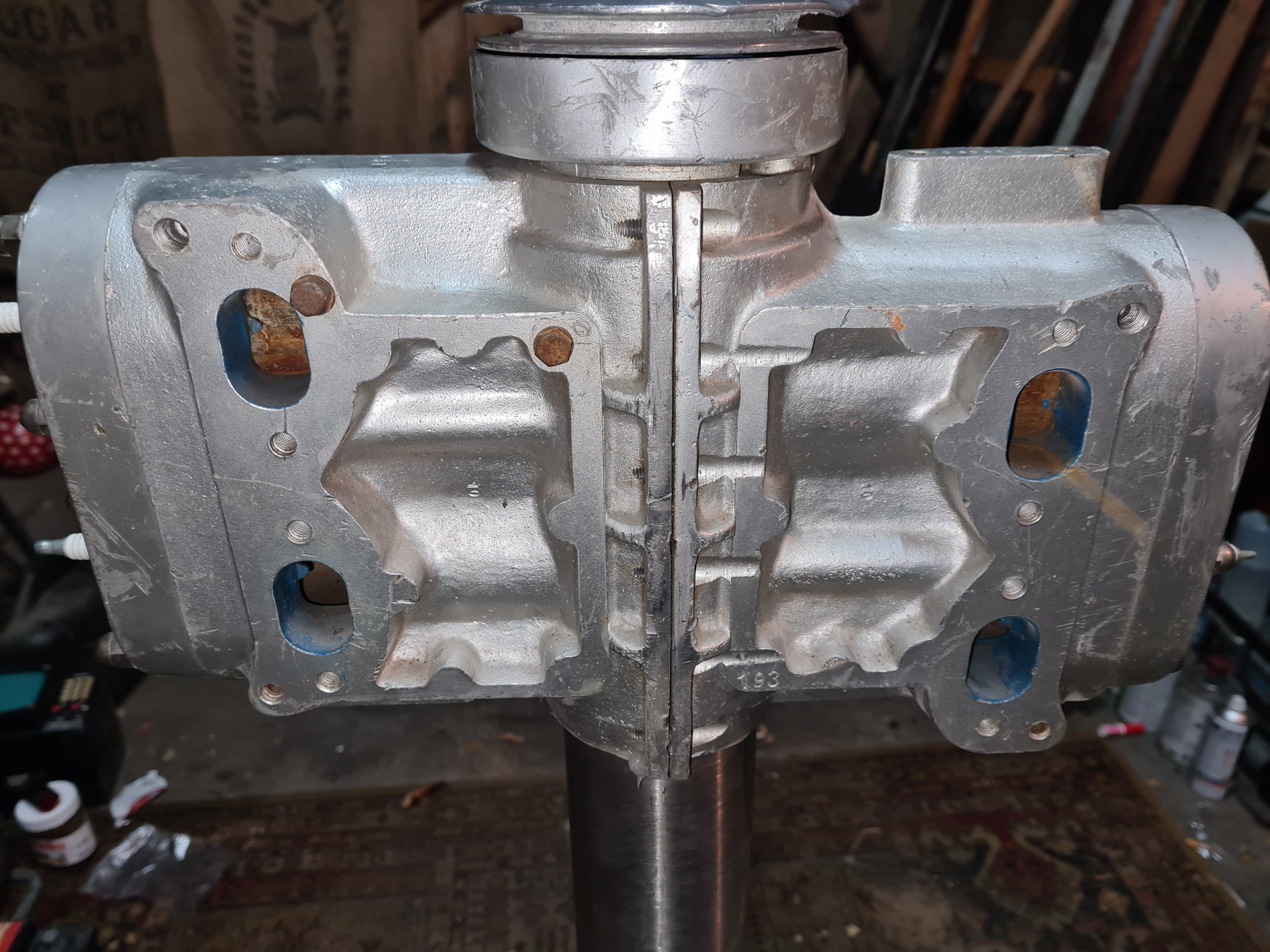 Die Kolben sind keine Standart Kolben, sehr leicht gebaut und nur ein kleiner Kolbenring. Vier Vergaser Anlage. Der Motor ist sehr leicht. Gehe ein bisschen in Richtung Rennsport.