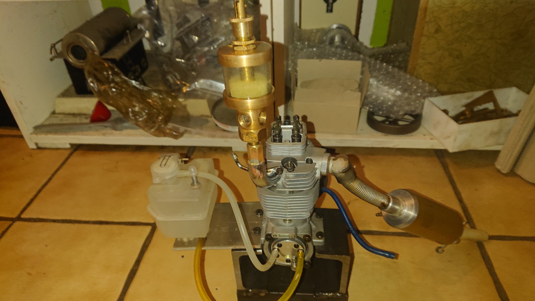 Ich habe einen Viertakt modellflugmotor als Standmotor umgebaut. Ich habe zwischen Zylinder und Zylinderkopf ein 4mm Distanzring aus Teflon zur Kompressionsreduzierung eingebaut und längere Stößelstangen angefertigt und ein Schweres Schwungrad eingebaut. Der Tropföler ist Tank und Vergaser. Der Kunststoff Tank ist funktionslos und stammt noch von den ersten Versuchen.