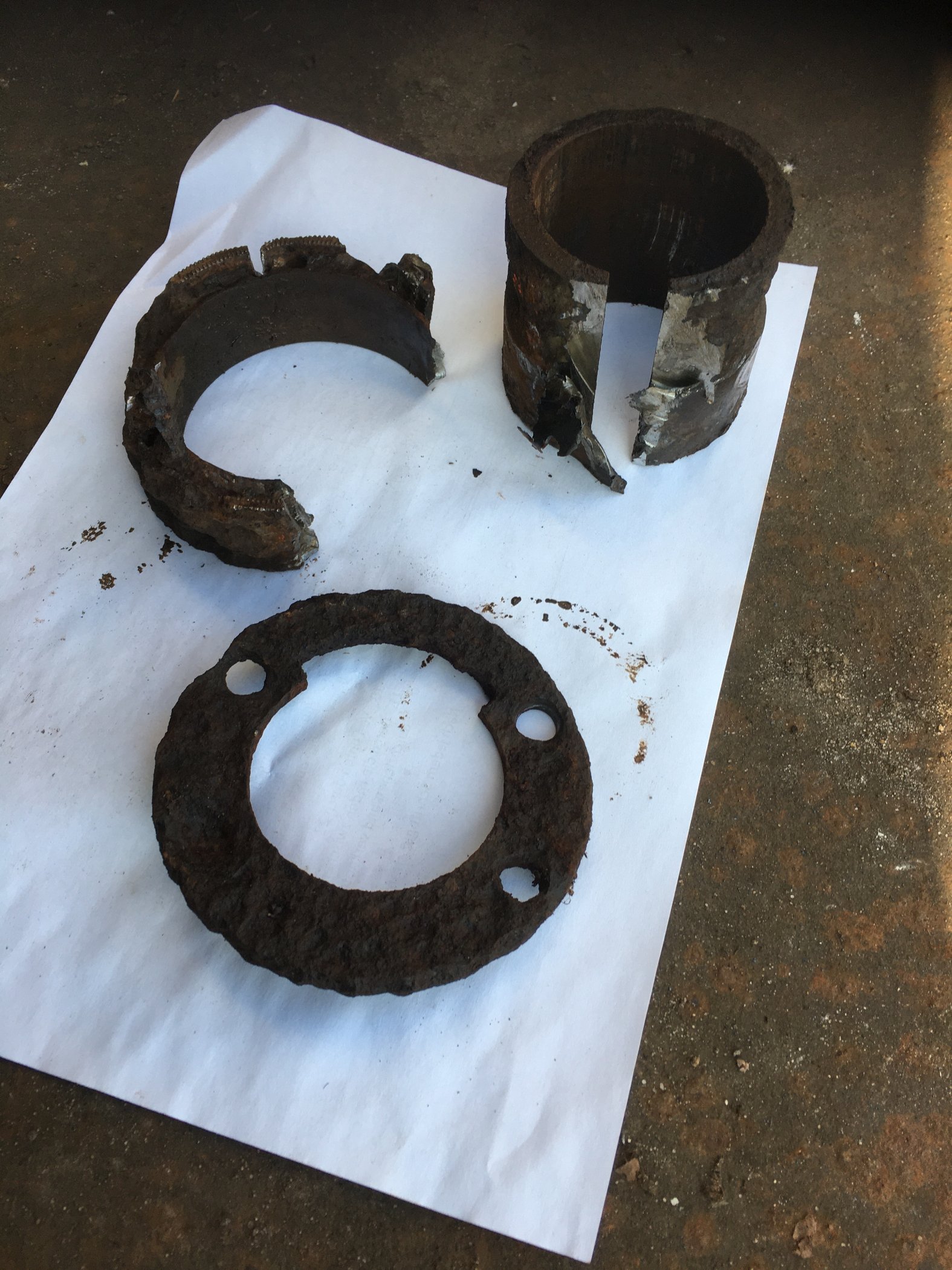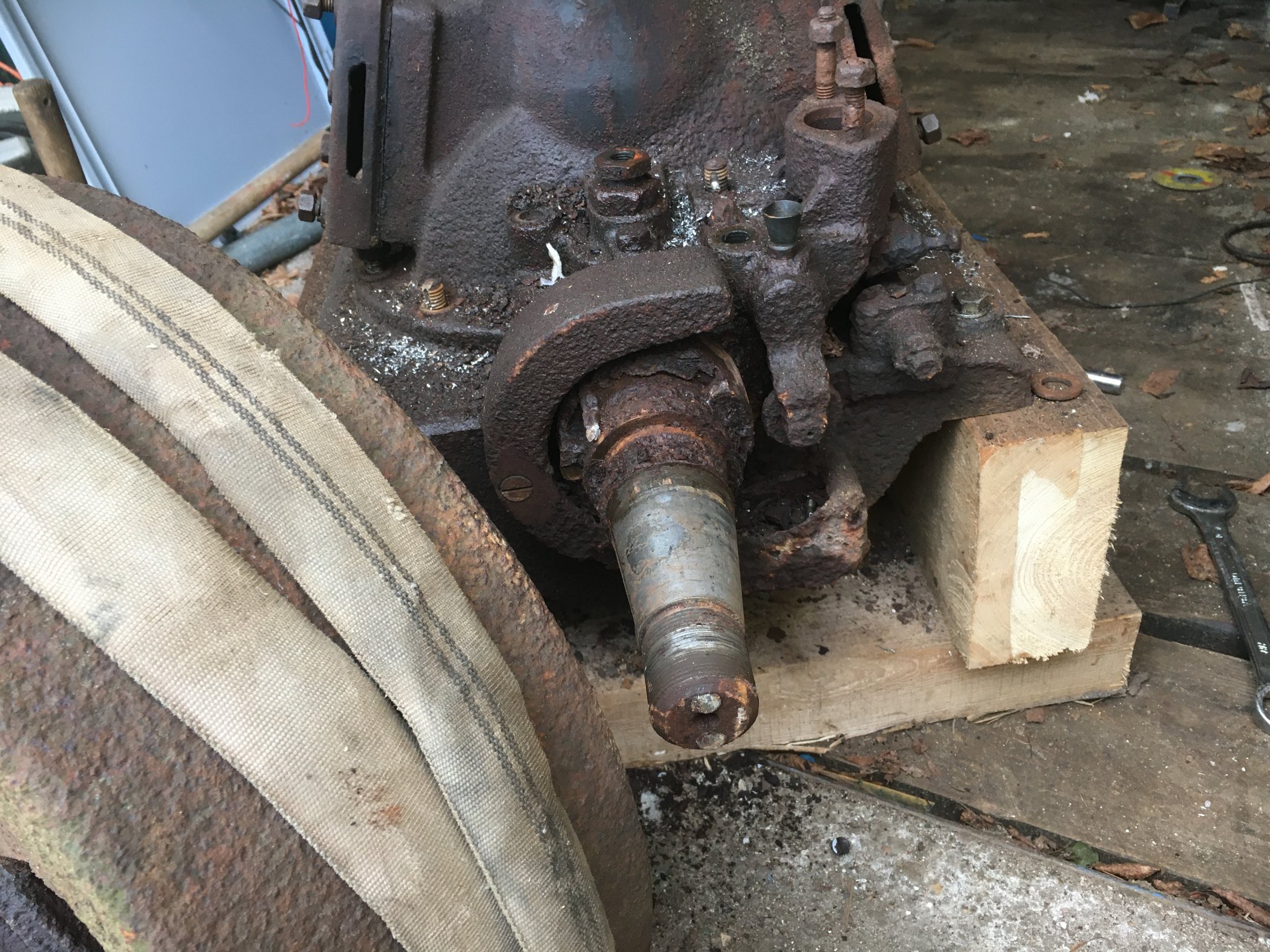 Da ist es: Schwungrad ab! Jahrzehnte Wasser haben an der Welle und am Einspritznocken gefressen. Mal sehen, wie ich den Nocken runter bekomme. Glücklicherweise habe ich noch einen baugleichen Motor bei dem die Zylindewandung weg ist. Das 3. Bild zeigt den KW Stumpf des Motors.